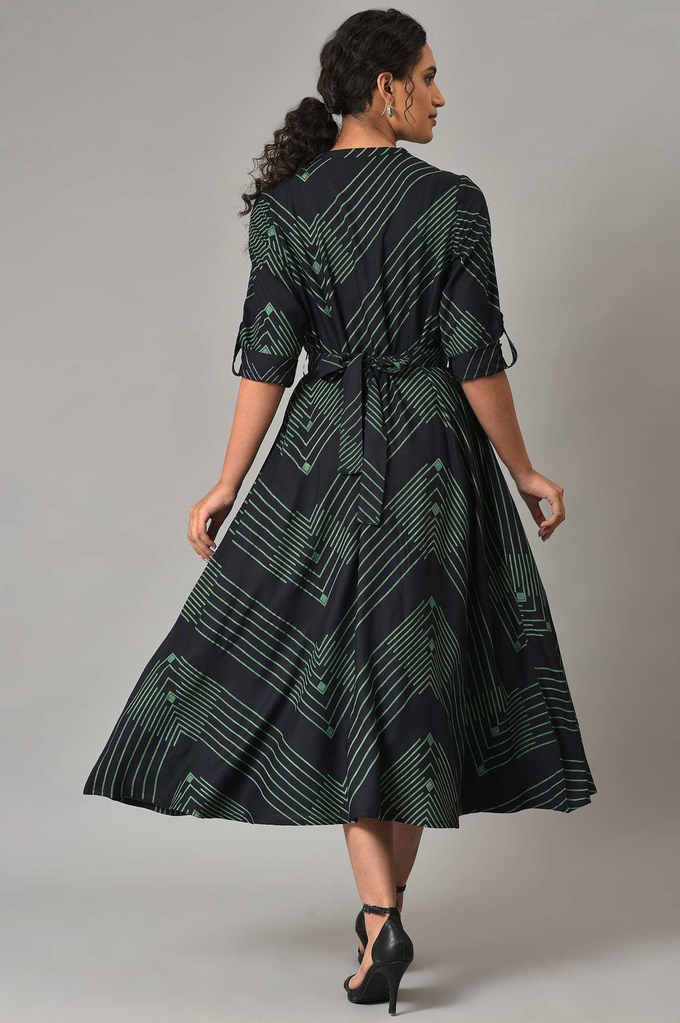 Black Matrix Printed Circular Shirt Dress With Belt.