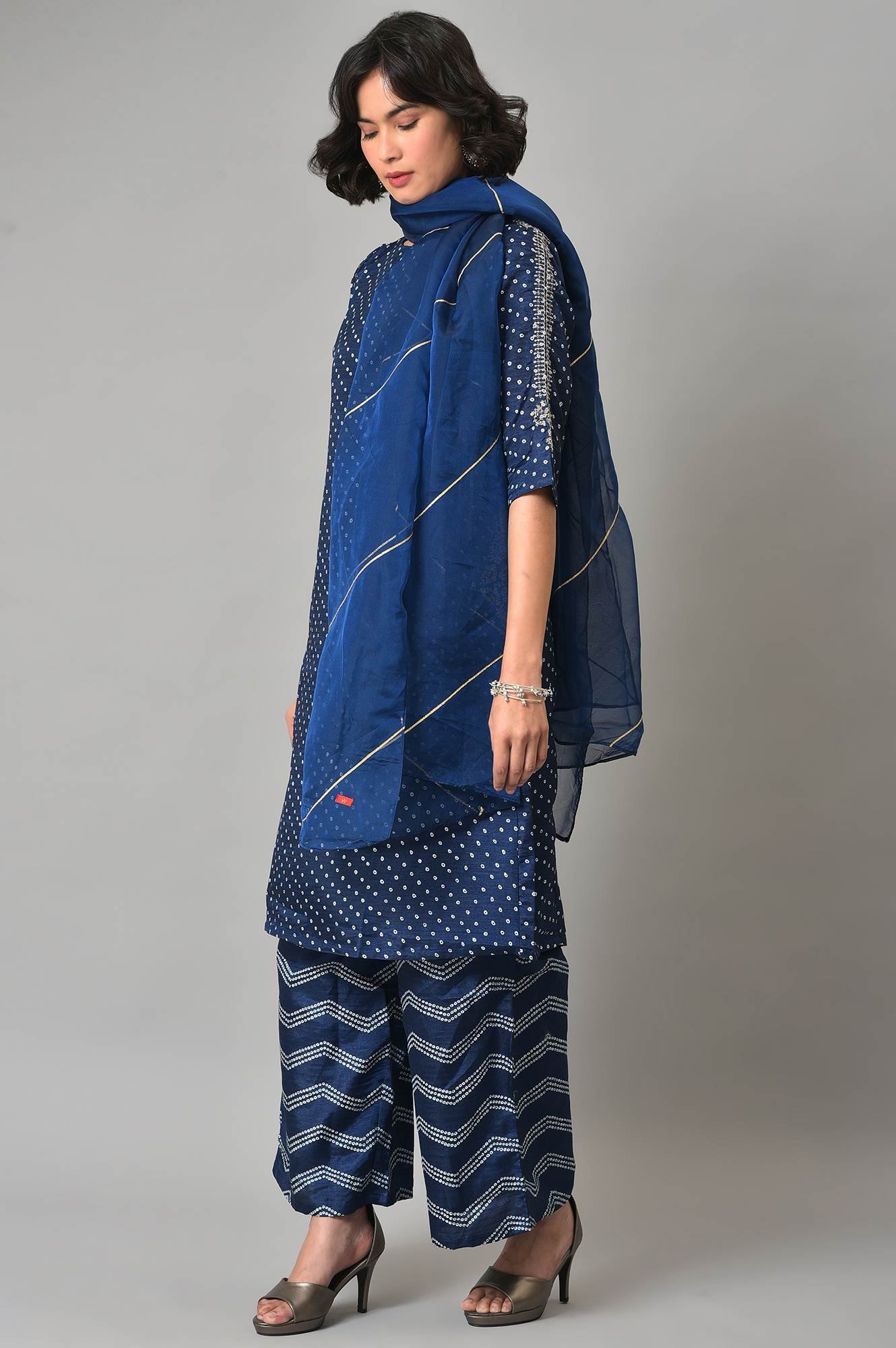 Midnight Blue Bandhani Printed Straight kurta With Metallic Embroidery. It Is Paired With Bandhani Printed Pants And Organza Drape With Gota Patti Work