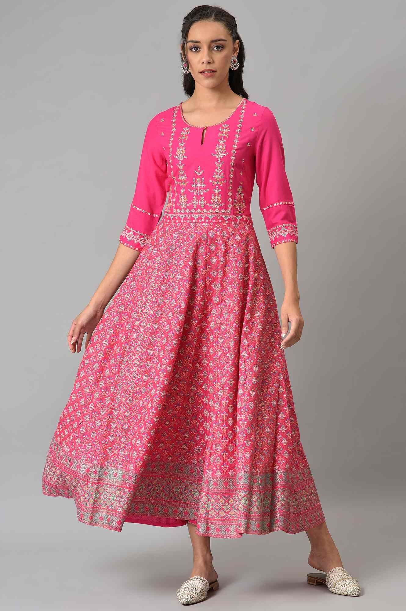 This Bright Rose Pink Flared Dress Is Your Answer For The Next Festive Look. Crafted In Premium Rayon Fabric The Dress Is Adorned With Glitter Floral Print And Embroidery On Yoke. It Comes In Keyhole Neckline With Button Closure.