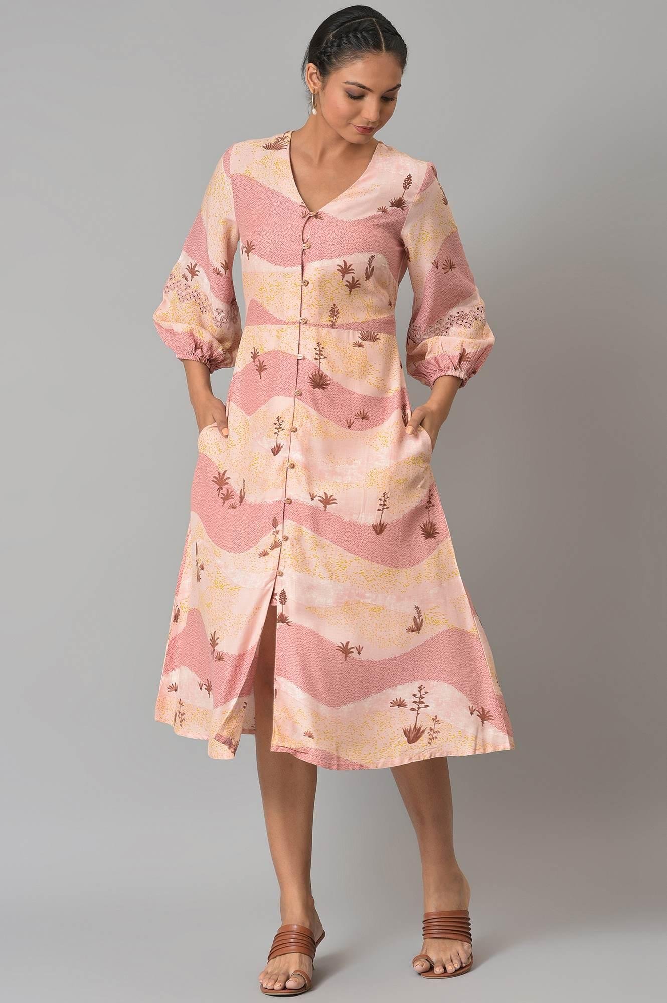 Elevate your style with this enchanting ethnic dress made from 100% viscose. The A-line silhouette in a beautiful pink shade features an eye-catching printed design, perfect for those special occasions. The v-neck adds a touch of sophistication, while the three-quarter sleeves offer versatility for different seasons. Crafted using a woven construction technique, this dress ensures both comfort and durability. The rayon fabric drapes elegantly, creating a flattering look for various body types. This dress seamlessly blends traditional ethnic elements with contemporary design, making it a standout piece for elevated events. The vibrant print adds visual interest and allows for creative accessorizing. Whether worn to a festive gathering or a formal event, this dress promises to make a lasting impression with its combination of comfort, style, and cultural charm.
