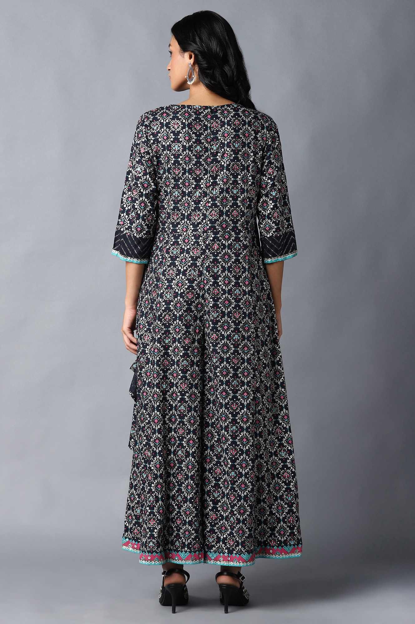 Navy Blue Angrakha Style Jumpsuit Is A Statement-Making Pick. For A Light Festive Look Or At Office Party, Style In This Contemporary Outifit. The Jumpsuit Has Round Neck With Zipper Closure, It Also Features Glitter Floral Print And One Side Pocket.