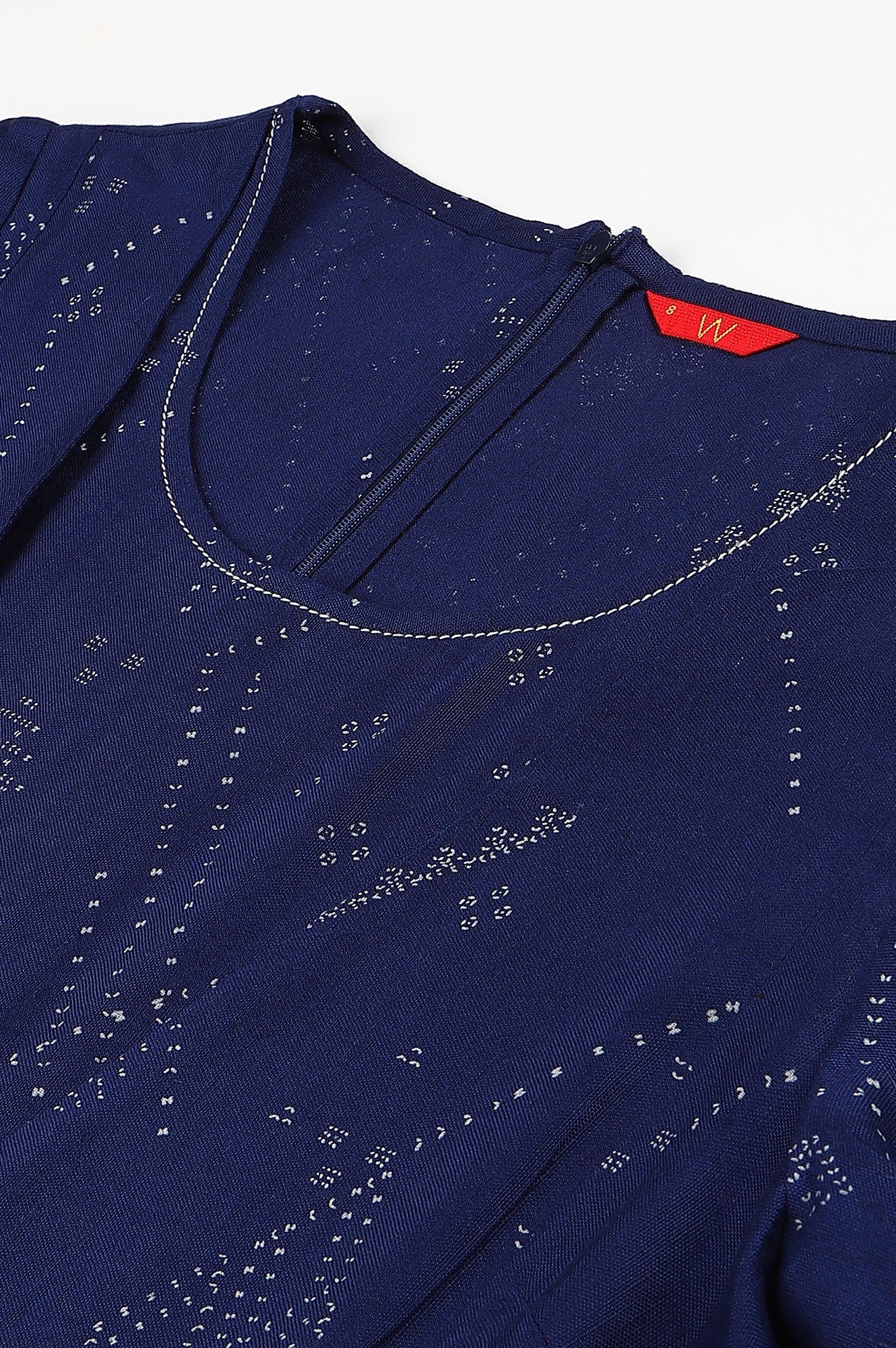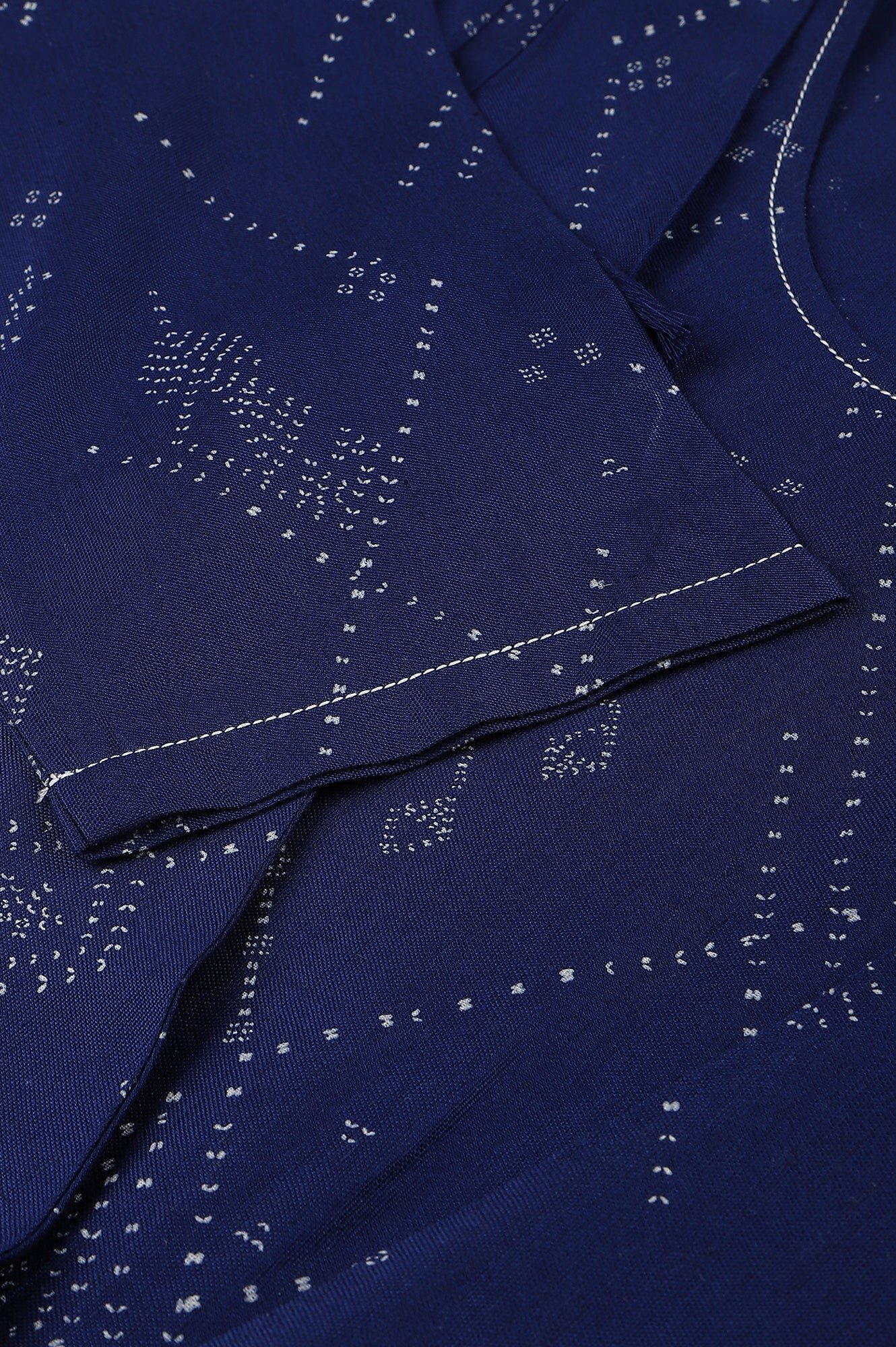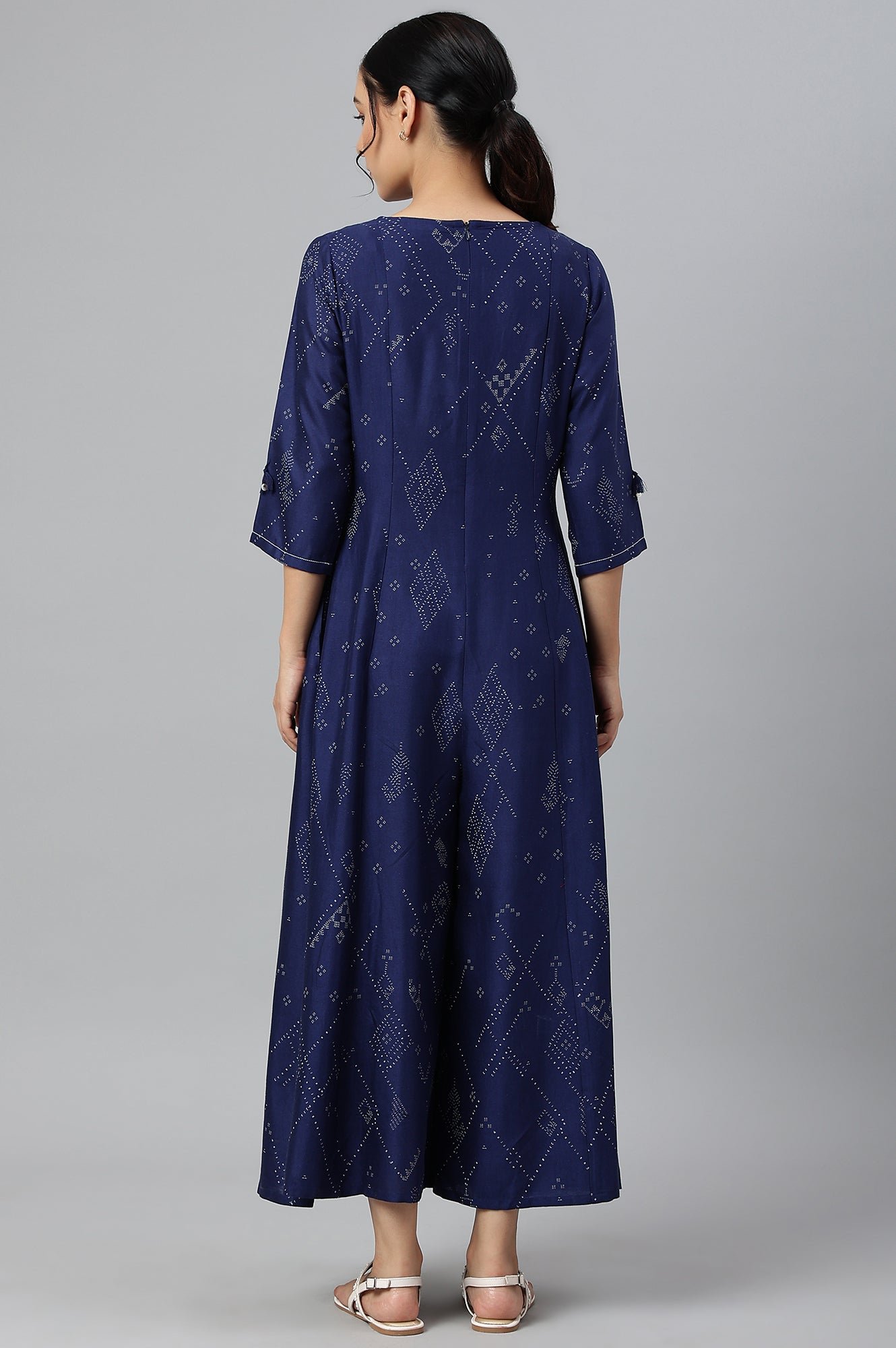 Dark Blue Mock Layered Jumpsuit With Embroidery Around Neckline And Shell Tassle Details On Sleeves