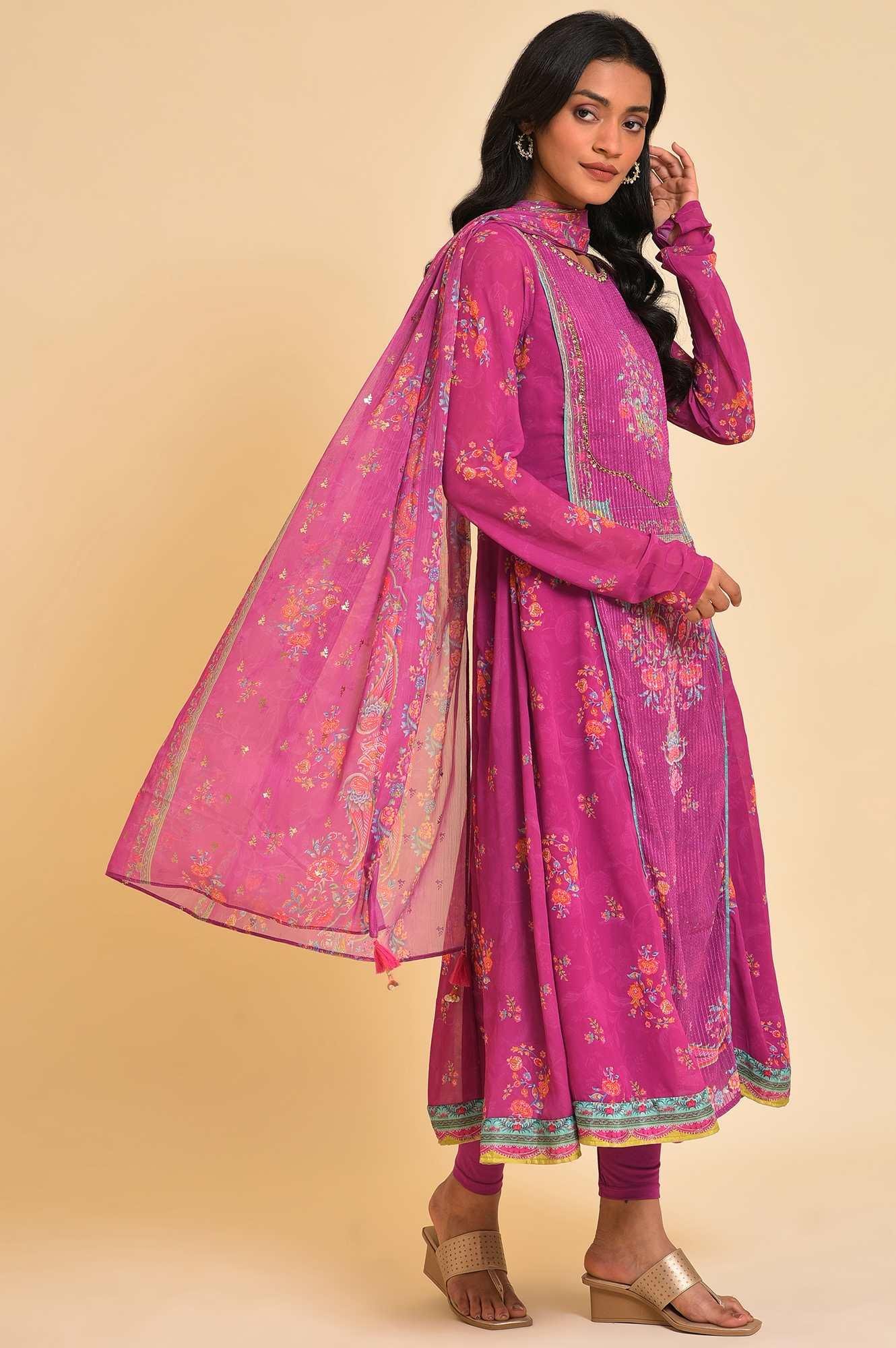 Take A Statement Walk In Any Festive Event With This Stunning Magenta Coloured Ethnic Set. The Set Has Anarkali Sequined kurta Which Is Adorned With Multi-Coloured Floral Print All Over And Beaded Neckline. The Set Also Includes Solid Skinny Tights And Printed Chiffon Dupatta.