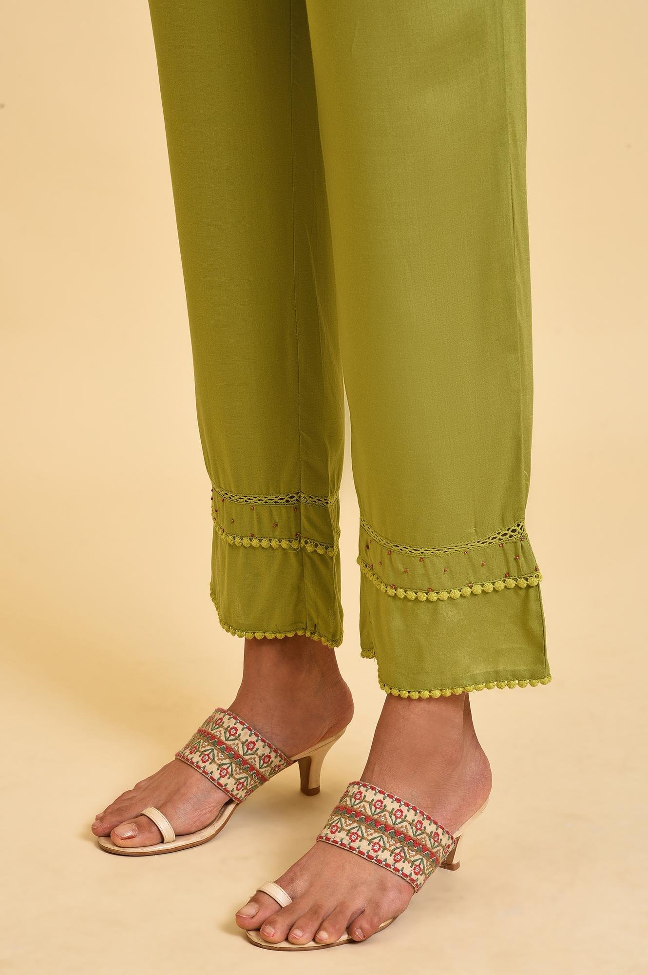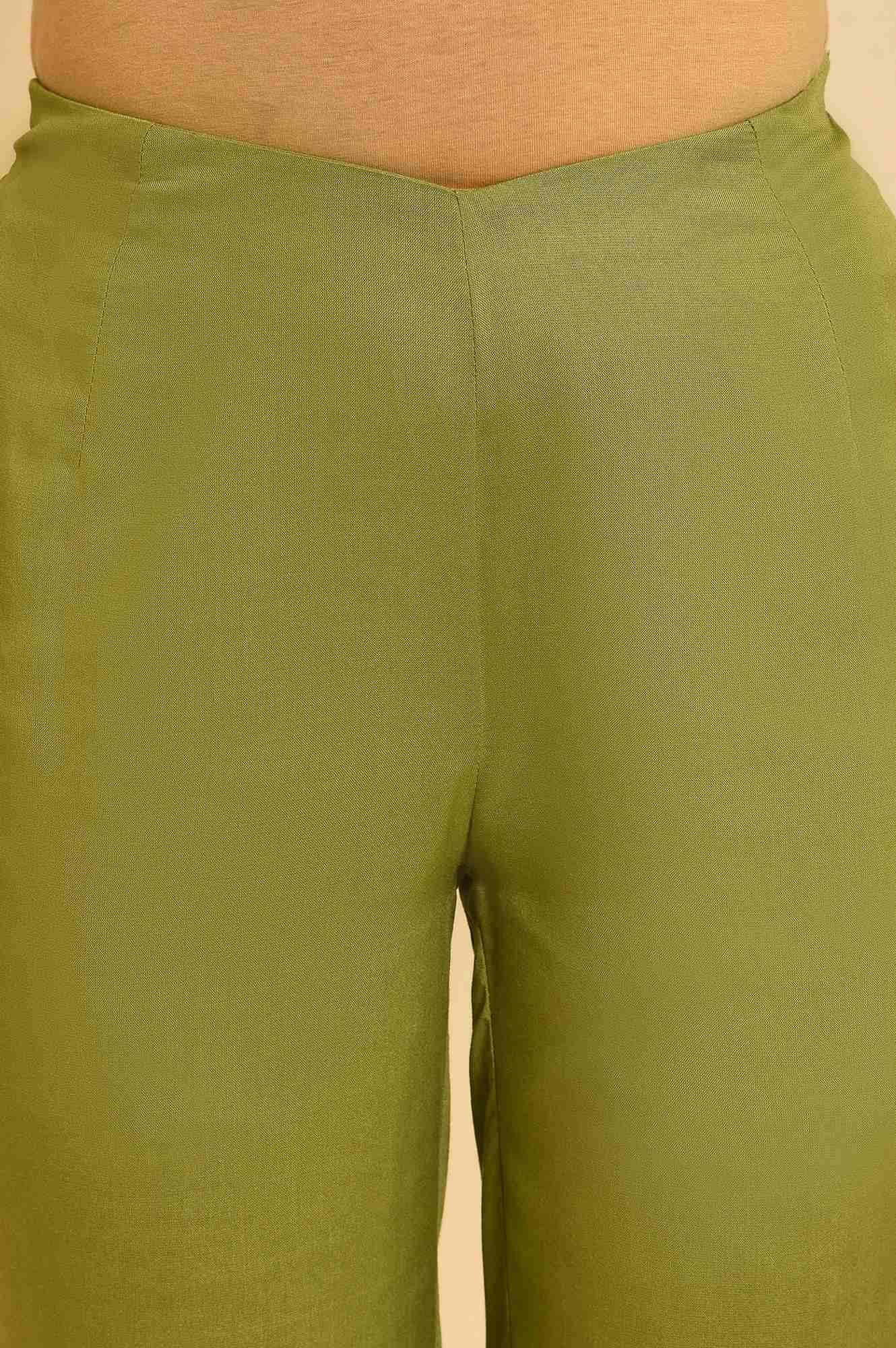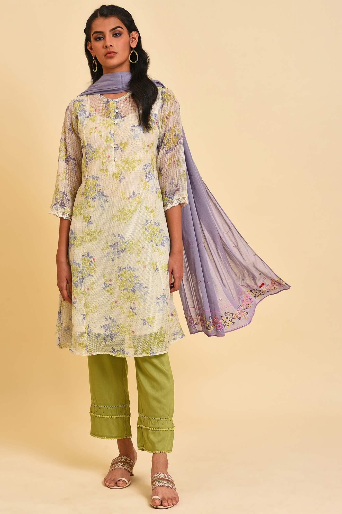 Ecru Kota kurta With Inner Set. The Set Includes Floral Printed kurta In Kota Fabric And It Has Inner. The Set Also Inlcudes Green Lace Pants And Purple Printed Dupatta.