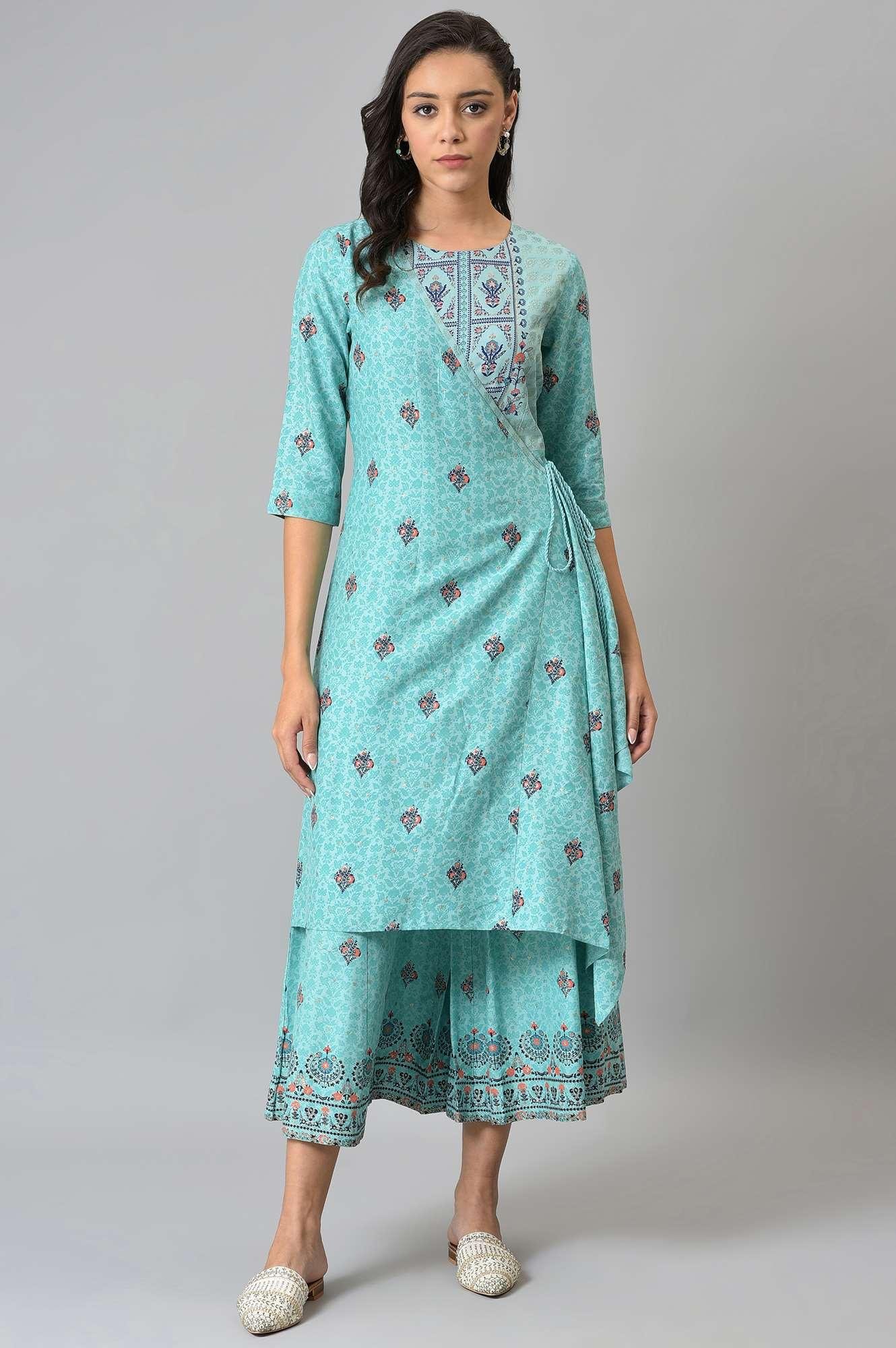 Blue Full Length Glitter Printed Light Festive Angrakha Jumpsuit
