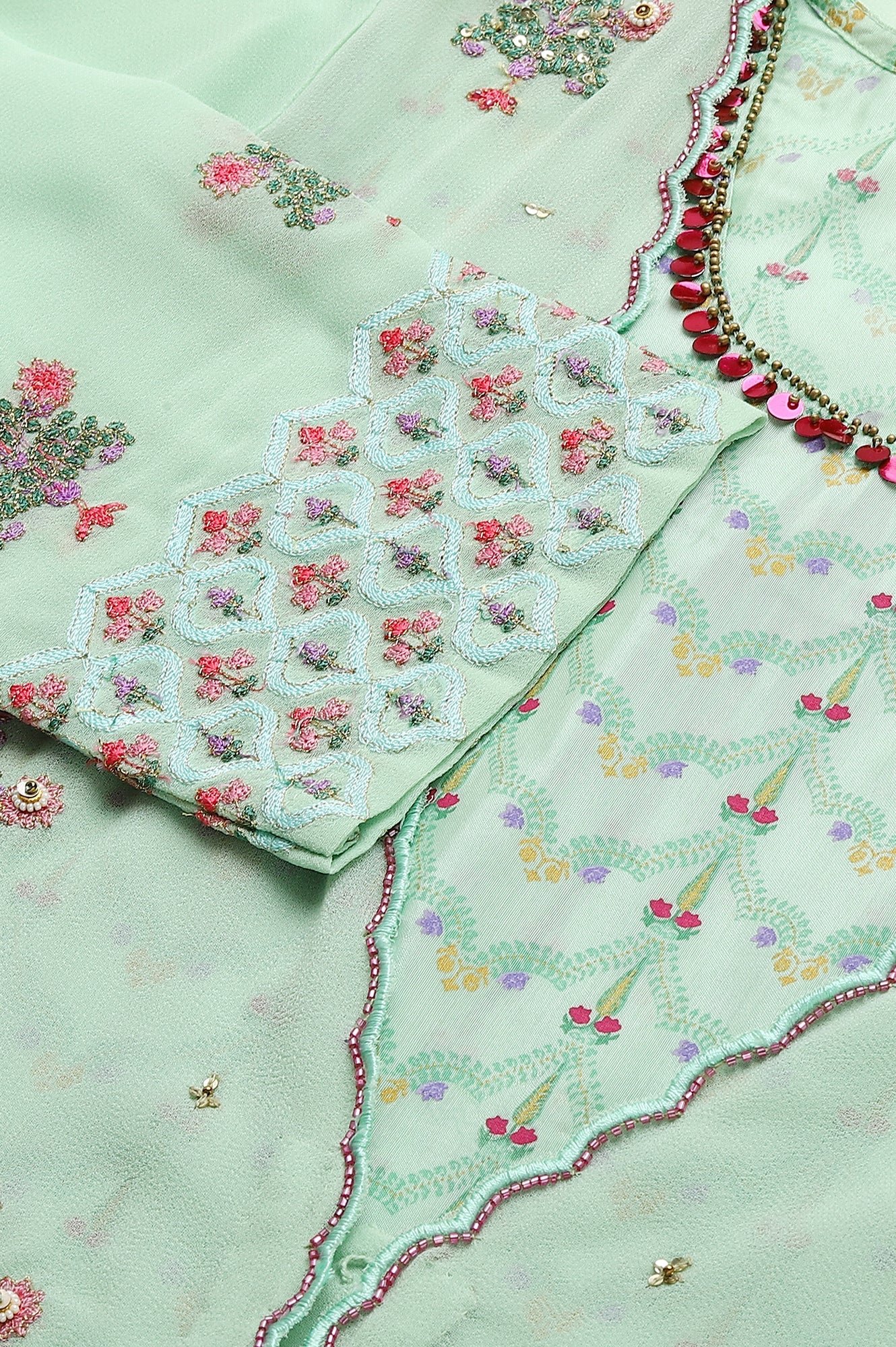 Printed Mint Green Shantung kurta With Embroidered Georgette Overlay And Tights