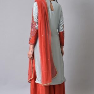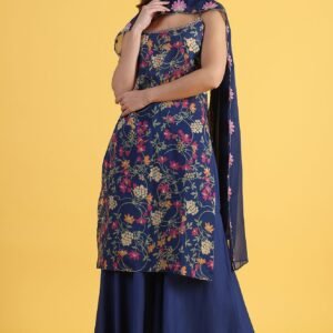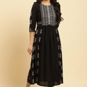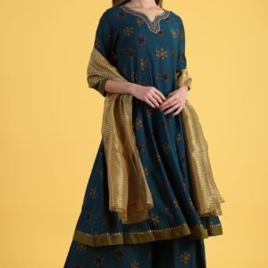 Embrace sophistication with this elegant blue kurta and salwar set, ideal for elevated occasions. The kurta boasts a straight silhouette and three-quarter sleeves, complemented by a round neckline and adorned with charming floral prints. Crafted from a blend of 90% rayon and 10% zori using a woven construction technique, this ethnic set offers both comfort and style. The rayon fabric ensures a soft, breathable feel, making it perfect for women who appreciate a fusion of traditional and modern fashion. This versatile ensemble is sure to become a staple in your ethnic wardrobe. It’s the perfect blend for an Indo-western outfit. Pair it with stylish sandals, and you’re ready to step out in effortless elegance.