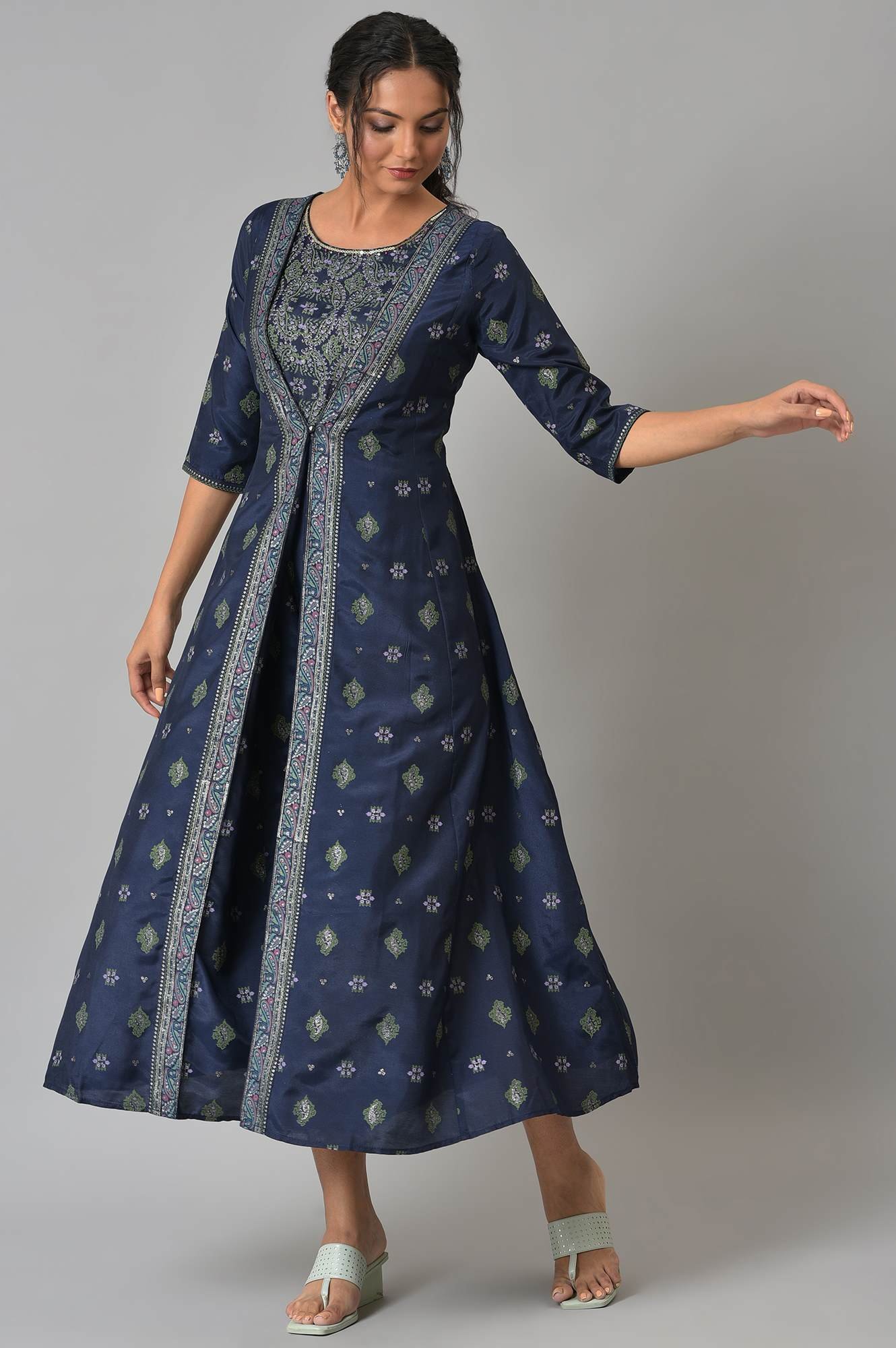 Navy Blue Paisley Printed Mock Layered Jumpsuit With Sequins And Beadwork Along The Neckline