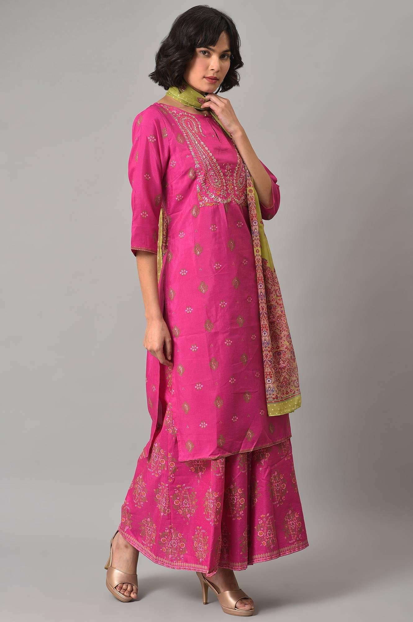 Make a playful yet graceful statement in this three-piece set featuring a pink glitter-printed kurta, matching culottes and a contrasting green dupatta. The shimmer-infused print gives a festive uplift to the kurta, while the flared culottes enhance comfort and movement. The green dupatta adds a vivid splash, tying the ensemble together with a festive charm. Designed for intimate celebrations, festive luncheons, or even day weddings, the set offers a bold yet wearable palette. This kurta set for women is thoughtfully designed to offer elegance without effort, with every element crafted to ensure ease, flair, and vibrant style. Whether accessorized or worn as-is, it’s a ready-to-go festive wardrobe win.
