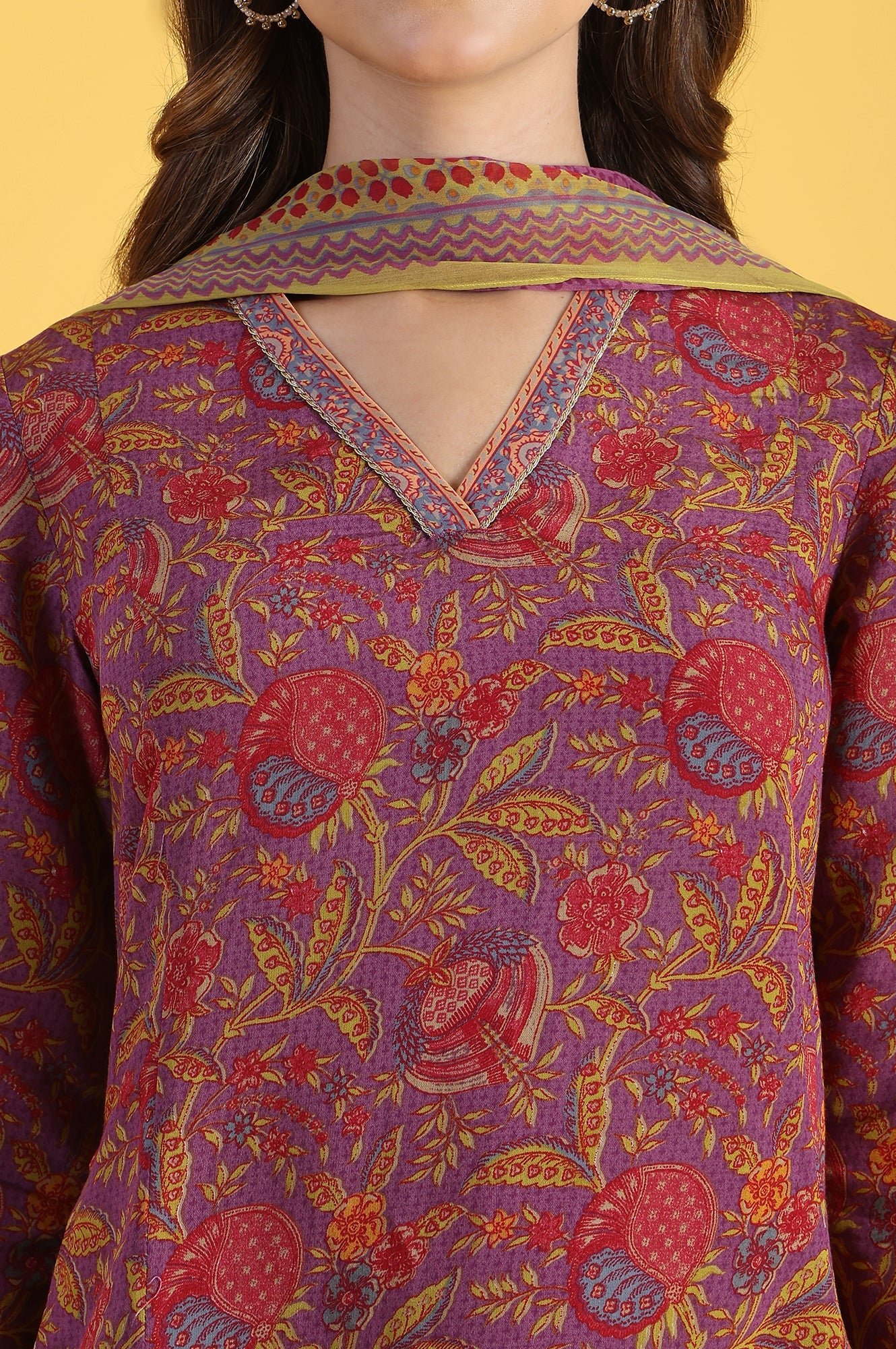 Embrace casual elegance with this fusion ethnic set from W in a rich deep purple hue. The ensemble comprises an a-line kurta paired with straight pants and a coordinating dupatta. The kurta features a v-neckline, three-quarter sleeves, and a stylish slit detail, adding a modern touch to the traditional silhouette. Crafted from viscose using woven construction techniques, this set offers both comfort and durability. The flared design of the kurta adds a graceful flow to your movements, while the straight pants provide a sleek contrast. Suitable for various casual occasions, this hand-washable set effortlessly combines style and practicality for the contemporary woman.