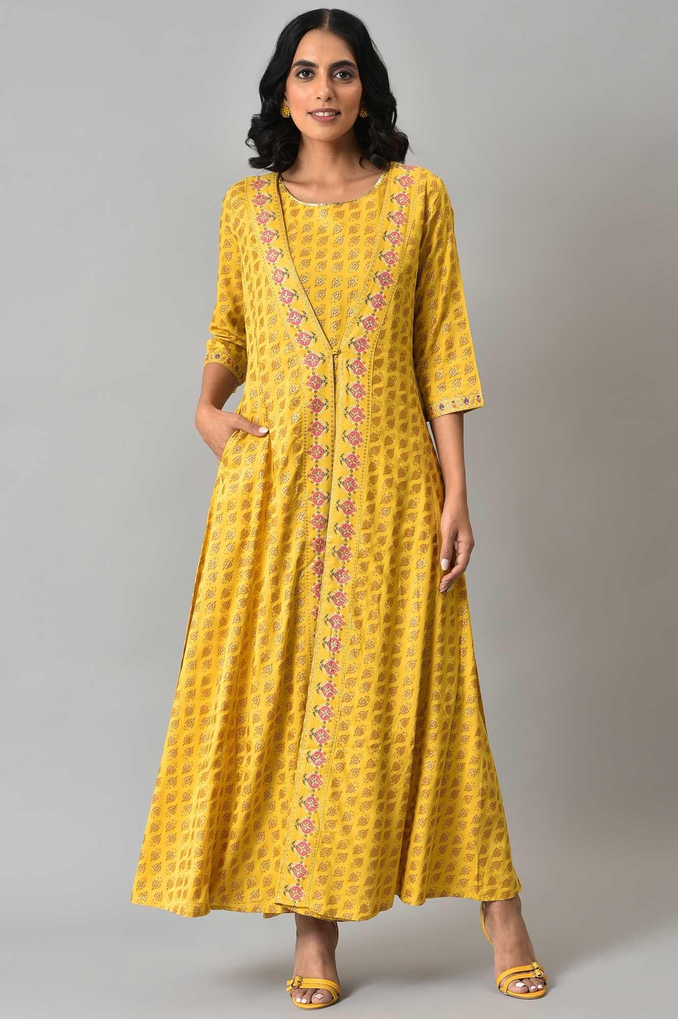 Bold and festive, this yellow glitter printed jumpsuit is styled with a mock layered silhouette giving modern vibes. Embellished details add celebratory charm, while glitter prints enhance its sparkle. Perfect as a festive jumpsuit for women, it ensures comfort with effortless elegance. The flowing fit drapes beautifully, making it suitable for wedding parties, cocktail evenings, or cultural celebrations. Its vibrant yellow hue radiates festive joy, while mock layering adds movement and contemporary flair. A standout festive outfit, it offers the perfect mix of tradition and modernity.